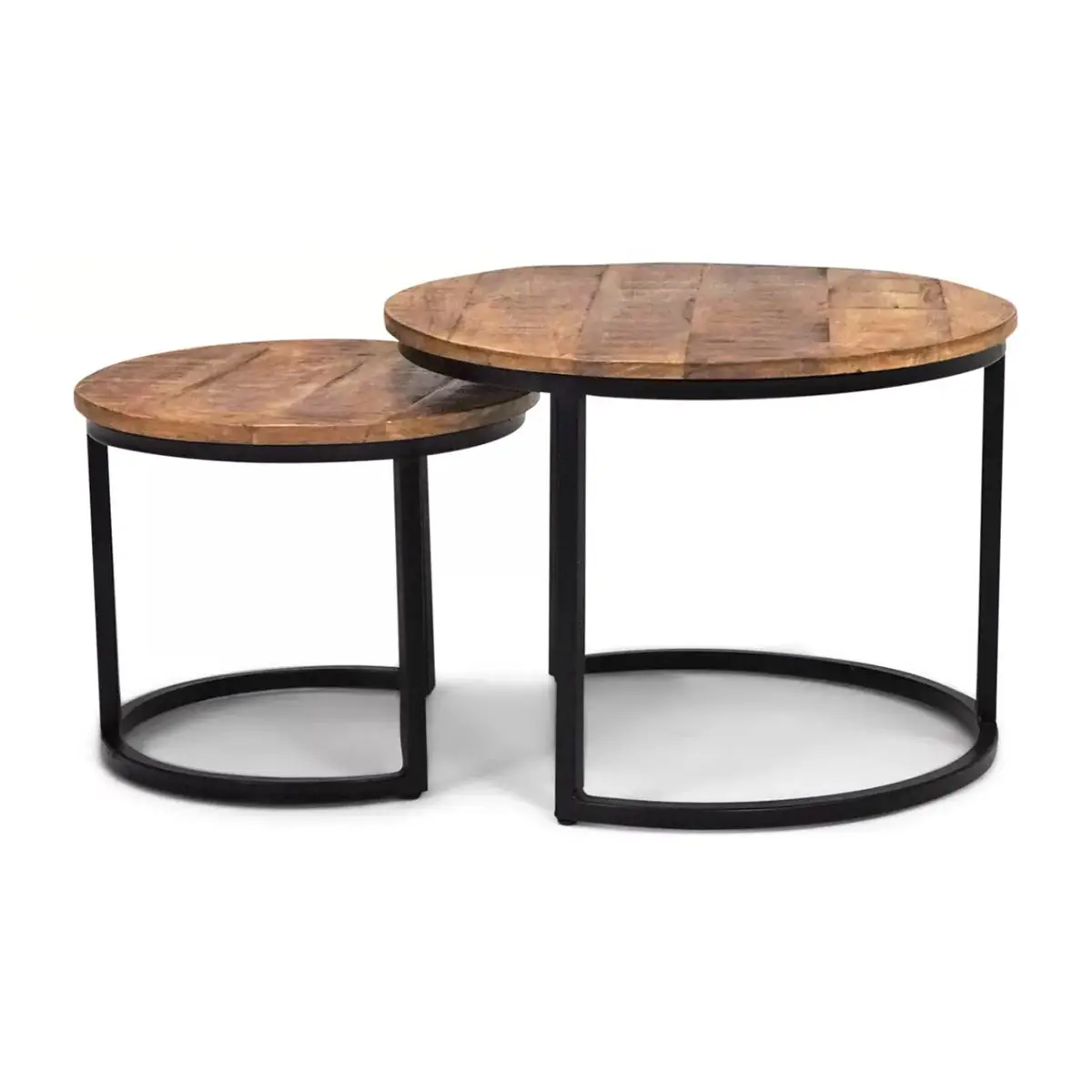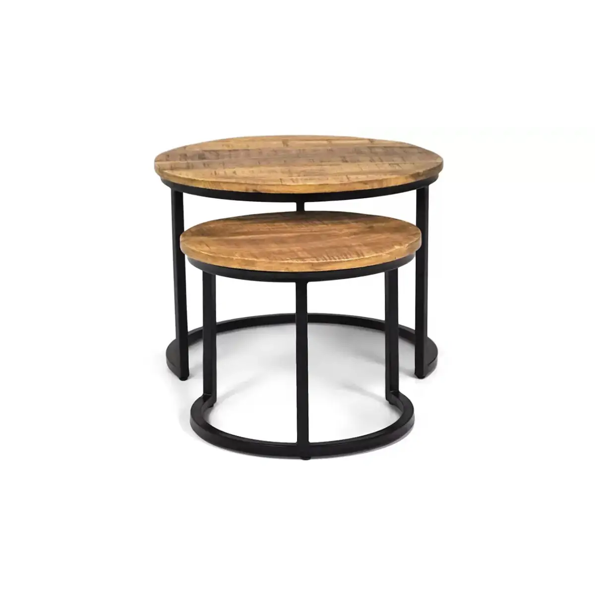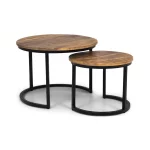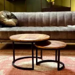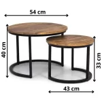 Die runden Tische haben eine zwei Zentimeter dicke Platte aus massivem Mangoholz und sind mit einer transparenten Lackierung versehen, die Untersetzer überflüssig macht. Die Metallfüße der Tische sind mattschwarz lackiert, so dass das Couchtisch-Set sowohl in moderne, industrielle als auch in ländliche Umgebungen passt.