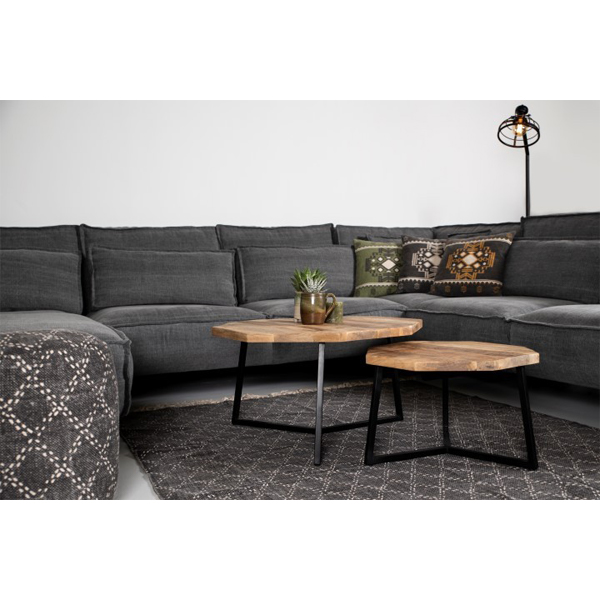 Der Balk besteht aus zwei Couchtischen, die zusammengesteckt oder übereinander geschoben werden können. Die runden Tische haben eine zwei Zentimeter dicke Platte aus massivem Mangoholz und sind mit einer transparenten Lackierung versehen, die Untersetzer überflüssig macht. Die Metallfüße der Tische sind mattschwarz lackiert, so dass das Couchtisch-Set sowohl in moderne, industrielle als auch in ländliche Umgebungen passt.